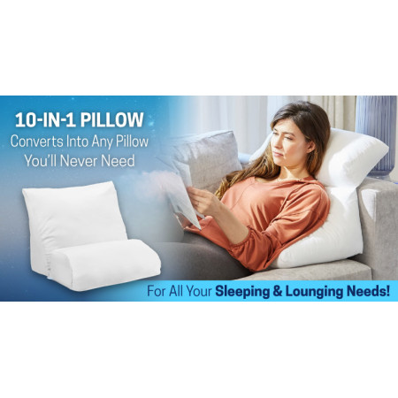 The 10-in-1 Flip Pillow transforms into a variety of positions to help you sleep, read, relax or watch TV in total comfort. Its unique, two-piece design makes it our most versatile pillow ever. Use it as a wedge to elevate your torso at night. Or, use it as a backrest to sit up in bed. You can even use it under your knees to reduce back pressure... the possibilities are endless.