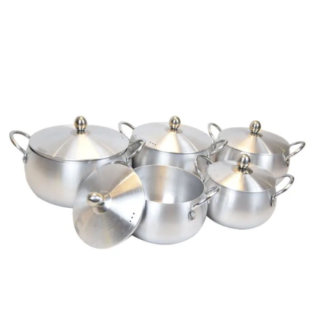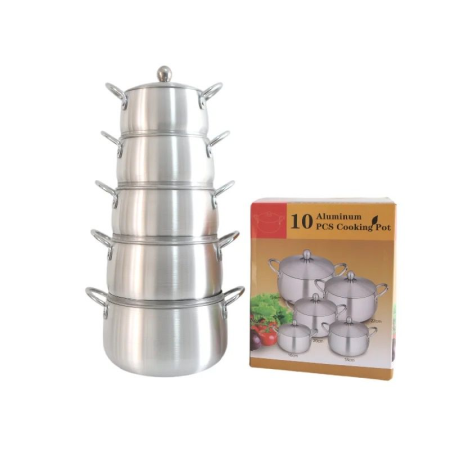 The 10-piece Cooking Pot Set combines durability, functionality, and style to make everyday cooking easier. Crafted from high-quality aluminum, these pots ensure even heat distribution for perfectly cooked meals. The surface allows for healthier cooking with minimal oil while also making cleanup quick and effortless. Designed with ergonomics in mind, the set offers safe handling and a comfortable grip. Its compact design saves space in your kitchen while still delivering reliable performance for frying, boiling, or everyday meal prep.