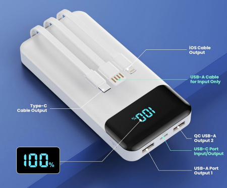 Stay powered wherever you go with our 22.5W 12,000mAh Power Bank! Compact yet mighty, it charges your devices fast and efficiently, whether at home, in the office, or on the move. With built-in cables, you’ll never fumble for cords again—just grab, plug, and go. Perfect for busy lifestyles, travel, and emergency power needs.