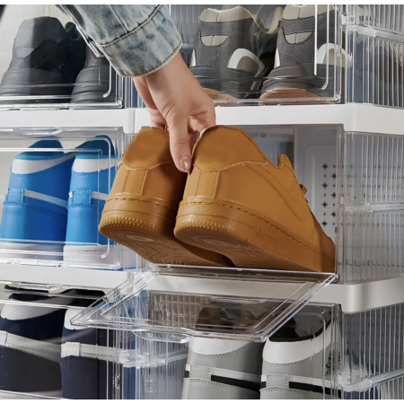 Introducing the 6-Layer Foldable Shoe Container, the ultimate space-saving solution for shoe lovers. This stylish, vertical organizer offers six roomy layers to store and display your footwear, keeping them protected, dust-free, and easy to access. Its foldable design makes it effortless to set up and pack away, perfect for any room or closet. Say goodbye to clutter and hello to smart, sleek organization with this durable, modern shoe storage solution.