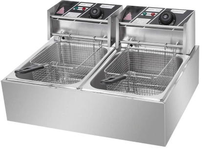 The Double 6L Deep Fryer is a powerful and versatile kitchen appliance designed to handle large frying needs with ease. Equipped with two 6-liter frying baskets, it allows you to cook two different foods simultaneously, ensuring efficiency and convenience. The fryer features adjustable temperature controls to accommodate a wide variety of cooking preferences. With a durable stainless steel construction, it is both sturdy and easy to clean, making it ideal for home kitchens, restaurants, or catering services. The fryer also includes a user-friendly, safety features like overheat protection, and a large oil capacity for optimal frying results. Perfect for preparing everything from crispy fries to golden chicken wings, the Double 6L Deep Fryer delivers professional-quality results every time.