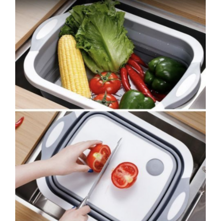 This kitchen tool can be used as a chopping board when folded or as a vegetable washing basket and strainer when unfolded. This convenient chopping board features a handy, collapsible drainer, perfect for cleaning fruits and veggies and food preparation. With its integrated plug and drainer, simply twist the plug to drain the water.