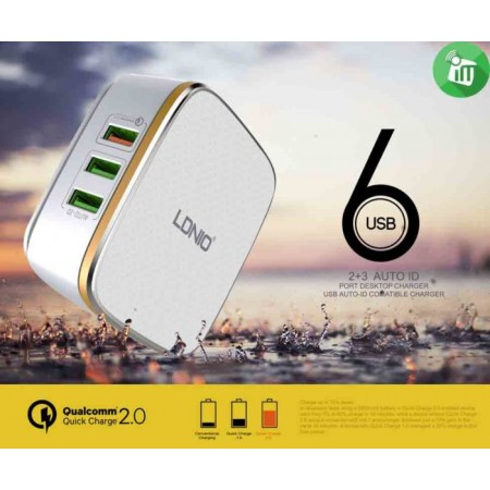 LDNIO 6 Port USB Charger designed to charge the iPad , iPhone, Samsung Tab, and Android devices at full speed.