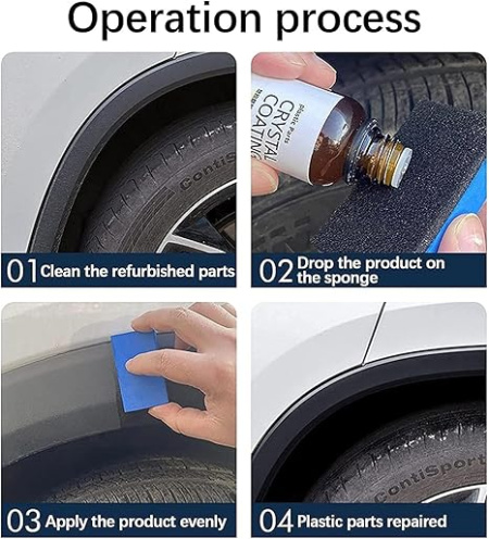 Designed for both beginners and experts alike, our Plastic Parts Refurbish Agent requires no prior experience. With just three simple steps, anyone can easily renew their car's plastic parts, making maintenance a breeze for everyone. Our Crystal Coating can be applied on dashboards, door frames, panels, pedals, and various plastic parts of your car. Enjoy astonishing results and a quick rejuvenation that will make your car look like new!
