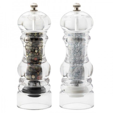 Clear acrylic salt & pepper mill set, boasts a classic design style that will compliment both modern and traditional interior design. Each mill boasts a clear encasement which allows you to see the peppercorns and rock salt, useful for when you need to refill the mills. Made from Acrylic.