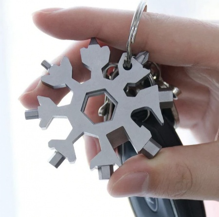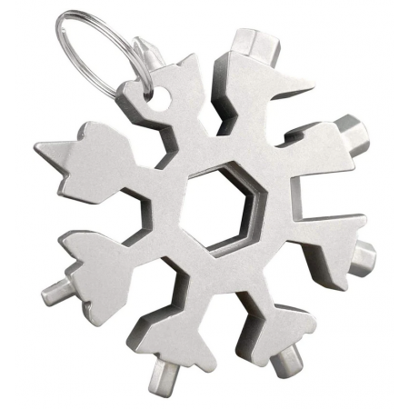 The Snowflake Multi-tool includes: a hex key allen wrench, open-end wrench, screwdriver, flat head screwdriver, bottle opener etc. It can be used to open beer bottles, screw in screws, fix skis, snowboard, bicycle, toys and so on. It comes with a key ring and can be hung on a key or a backpack.